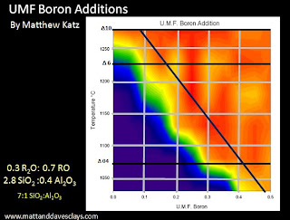 We've also added a copy of the famous Stull Glaze map, which documents the melting of glazes. Also my new companion map on the UMF limits of Boron. You can see this map at the top of this post, I am super proud of it and I think it will change the way we all deal with glaze chemistry and temperature. As the sheet documents exactly how much Boron your glaze needs at any temperature From Cone 10 to below Cone 04. Super Cool!